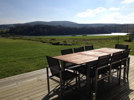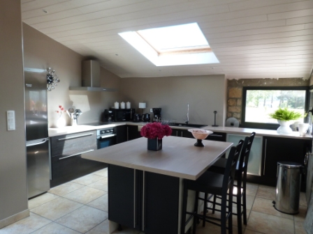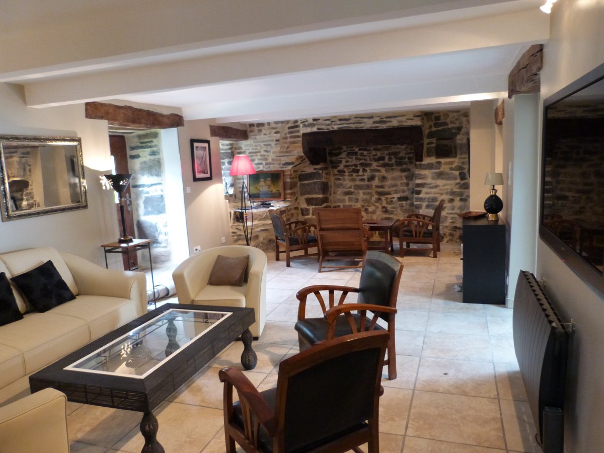 Ideal central room of the Manor, with higt wooden beams and stone walls with panoramic views of the river and the ‘Menez-Hom’ beyond.