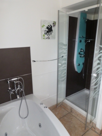 New luxury bathroom with high pressure shower and Jacuzzi bath - hair drier.